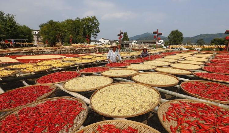 秋天,是收獲的季節(jié)。安徽省黃山市呈坎古村村民將收獲歸倉的玉米、黃豆、紅辣椒等農(nóng)作物果實因地制宜晾曬,在古村曬場上描繪出一幅豐收曬秋圖。