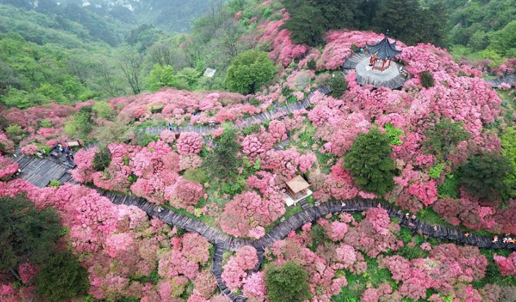 近日,湖北省麻城市龜峰山的10萬(wàn)畝古杜鵑盛開,大量游客前來(lái)賞花觀景。