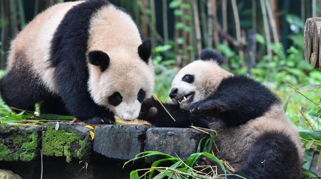 正在享受竹子大餐的廣州長(zhǎng)隆野生動(dòng)物世界大熊貓婷仔被大熊貓隆仔搶食,兩只大熊貓上演一場(chǎng)爭(zhēng)食戲碼。