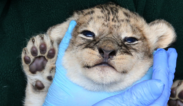 英國斯特靈,布萊爾德拉蒙德野生動(dòng)物園四只三周大的幼獅接受首次健康檢查。