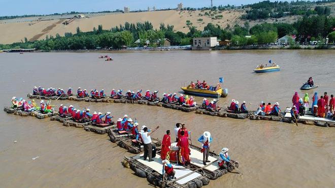 當(dāng)日,“情系母親河——皮筏對(duì)歌唱響家鄉(xiāng)情”活動(dòng)在寧夏中衛(wèi)市沙坡頭景區(qū)舉行。
