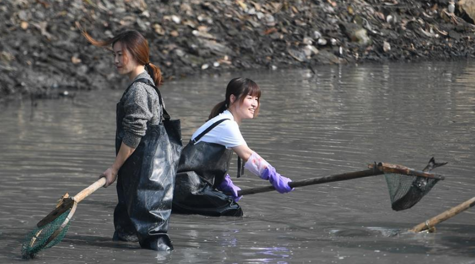 近日在杭州西溪國家濕地公園,漁夫們抽掉塘水清理淤泥,一批游客借用漁夫們的下水褲,體驗“干塘”捕魚。