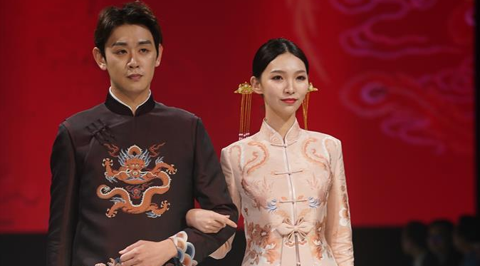 主題秀上展示大量帶有龍鳳、牡丹、海棠、彩蝶等中國(guó)傳統(tǒng)文化元素的宋錦中式婚慶禮服。