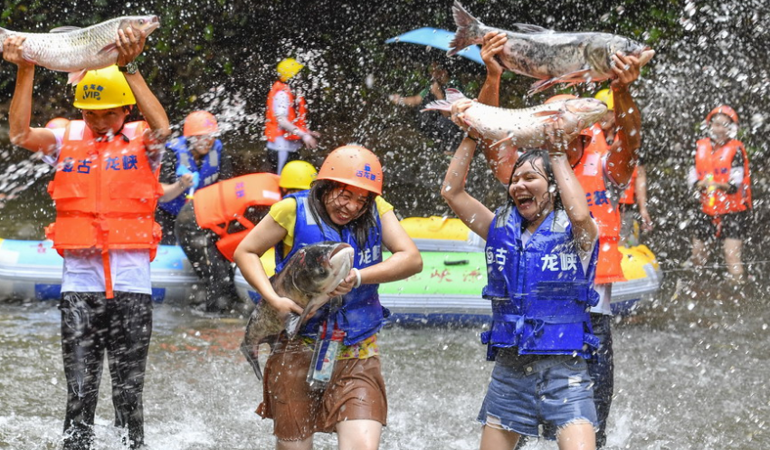 2019年8月2日,廣東清遠,臺風(fēng)“韋帕”不但帶來風(fēng)雨,還給游客帶來捕魚之樂。