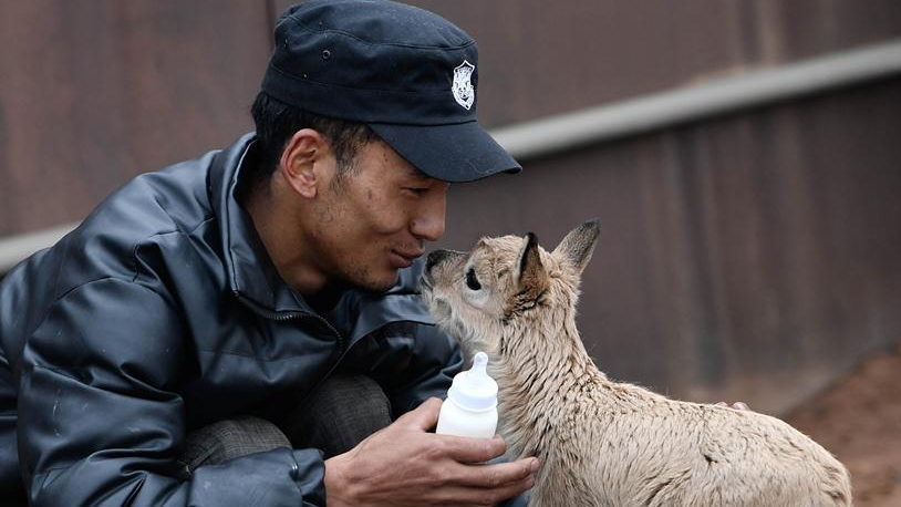 7月7日,三江源國(guó)家公園管理局長(zhǎng)江源園區(qū)可可西里管理處卓乃湖保護(hù)站的工作人員才文多杰在給藏羚羊幼仔喂奶。