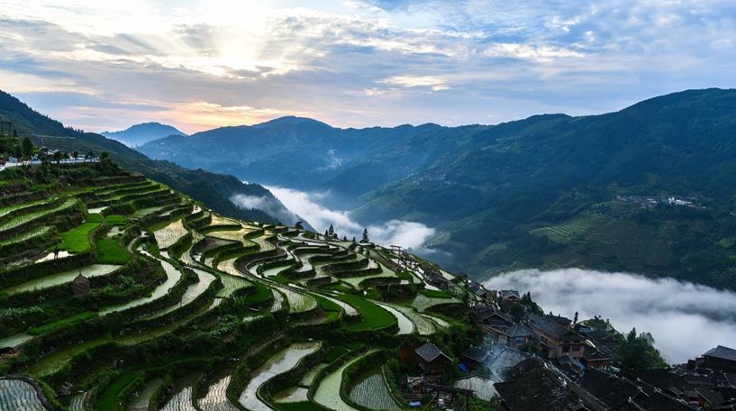 夏日時(shí)節(jié),位于貴州省黔東南苗族侗族自治州從江縣加榜鄉(xiāng)加車、加頁、黨扭等苗寨的梯田在晨霧與陽光的映襯下線條分明,光影變幻,景色如畫。