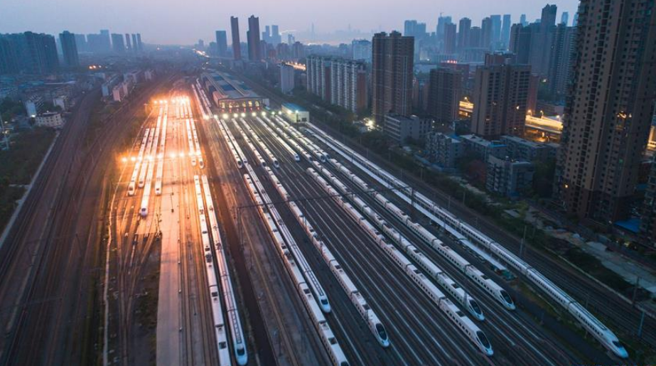 當日,武漢市正式解除離漢離鄂通道管控措施,幾十組在武漢動車段經(jīng)過檢修消殺的動車組,猶如“陸地艦隊”??吭诖孳嚲€上,蓄勢待發(fā),重新啟程。