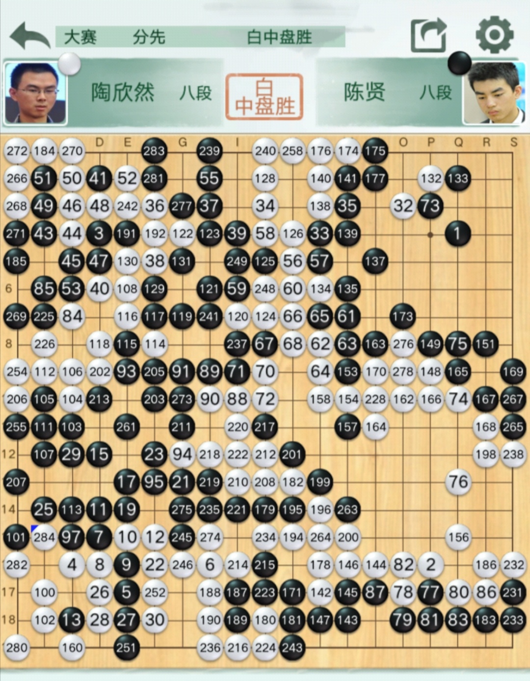 四臺:陶欣然八段執(zhí)白(勝)陳賢八段