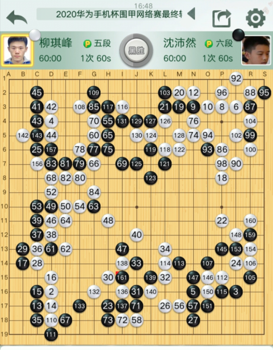 沈沛然自評:布局大致兩分,中盤白棋76斷失誤,應(yīng)當(dāng)左上角斷補,那樣局面尚早,實戰(zhàn)形成轉(zhuǎn)換黑棋大賺,勝局已定。