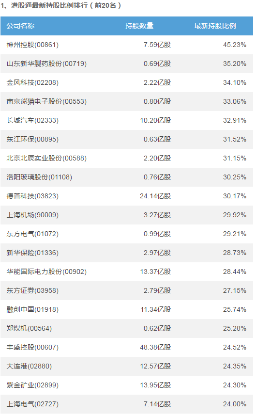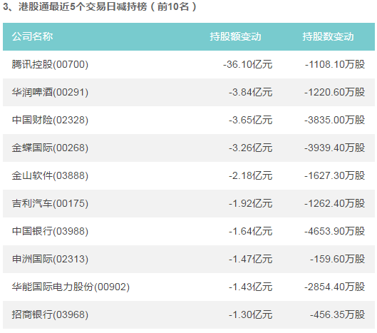 智通財(cái)經(jīng)APP獲悉,截止2018年8月16日,神州控股(00861)、山東新華製藥股份(00719)、金風(fēng)科技(02208)位居港股通持股比例前3位,分別為45.23%、35.20%、34.10%。此外,工商銀行(01398)、中國恆大(03333)、中國平安(02318)在最近5個(gè)交易日內(nèi),持股額增幅最大,分別為+11.60億元、+4.08億元、+2.84億元;騰訊控股(00700)、華潤啤酒(00291)、中國財(cái)險(xiǎn)(02328)在最近5個(gè)交易日內(nèi),持股額減幅最大,分別為-36.10億元、-3.84億元、-3.65億元。