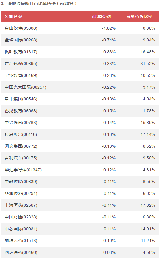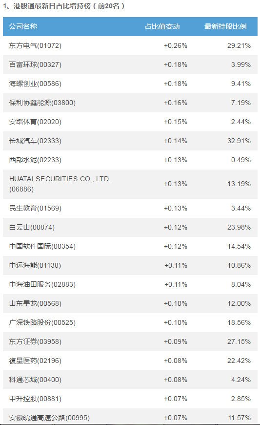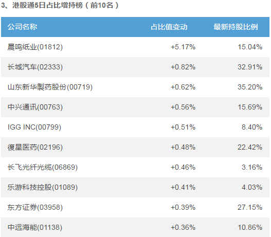 在最近5個(gè)交易日內(nèi),晨鳴紙業(yè)(01812)、長(zhǎng)城汽車(02333)、山東新華製藥股份(00719)港股通持股占比增加值最大,分別增加5.17%、0.82%、0.62%;金蝶國(guó)際(00268)、金山軟件(03888)、阜豐集團(tuán)(00546)港股通持股占比減少值最大,分別減少-1.26%、-1.25%、-0.86%。