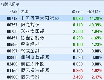 智通財經APP獲悉,多只炒高的光伏股今日顯著回吐,截至11時53分,卡姆丹克太陽能(00712)跌14.29%,報價0.09港元,陽光能源(00757)跌13.39%,報0.11港元。