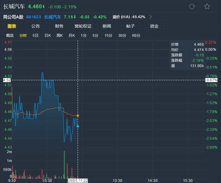 截至發(fā)稿,長城汽車報4.46港元,跌2.19%。(文文)