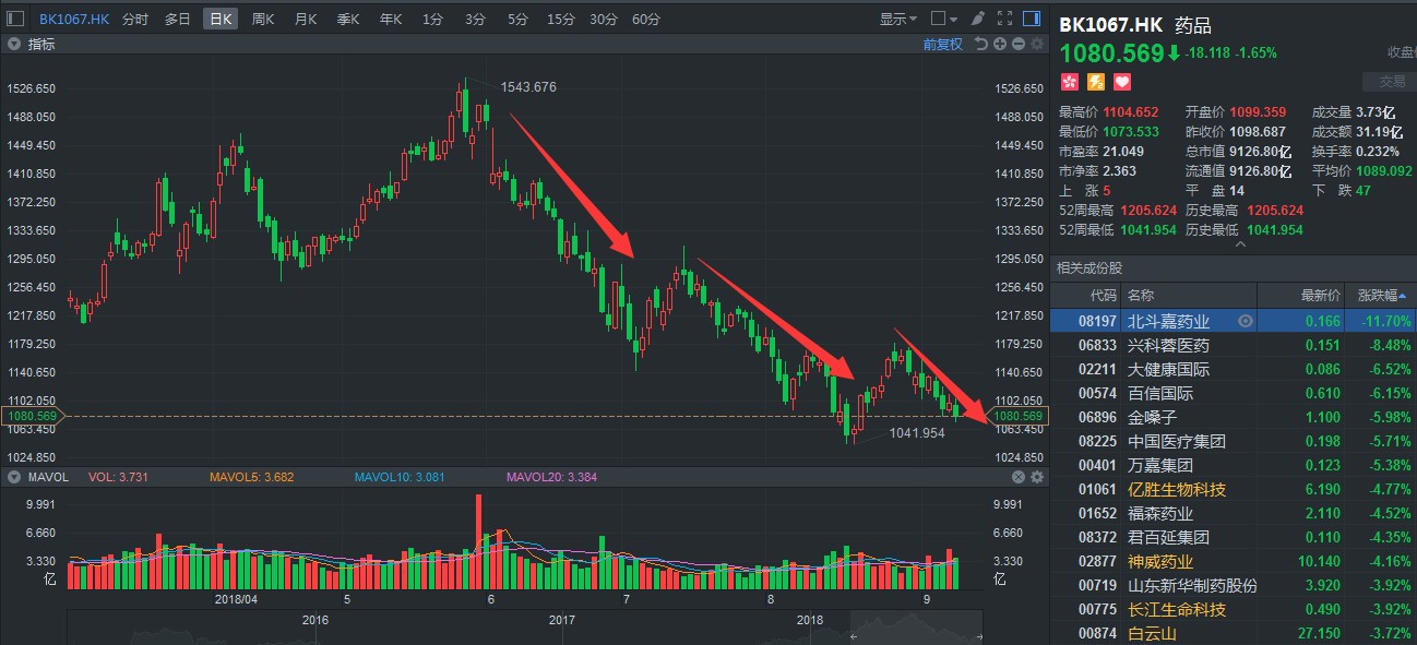 據(jù)智通財經(jīng)APP觀察,截至9月10日,上證跌了1.21個點;恒指跌幅超過1.33%,50只成分股,僅包括九龍倉置業(yè)(01997)在內(nèi)的6只股票小范圍飄紅,而醫(yī)藥板塊方面,繼續(xù)下挫,普遍以“掛綠”收盤,大勢可謂慘不忍睹。