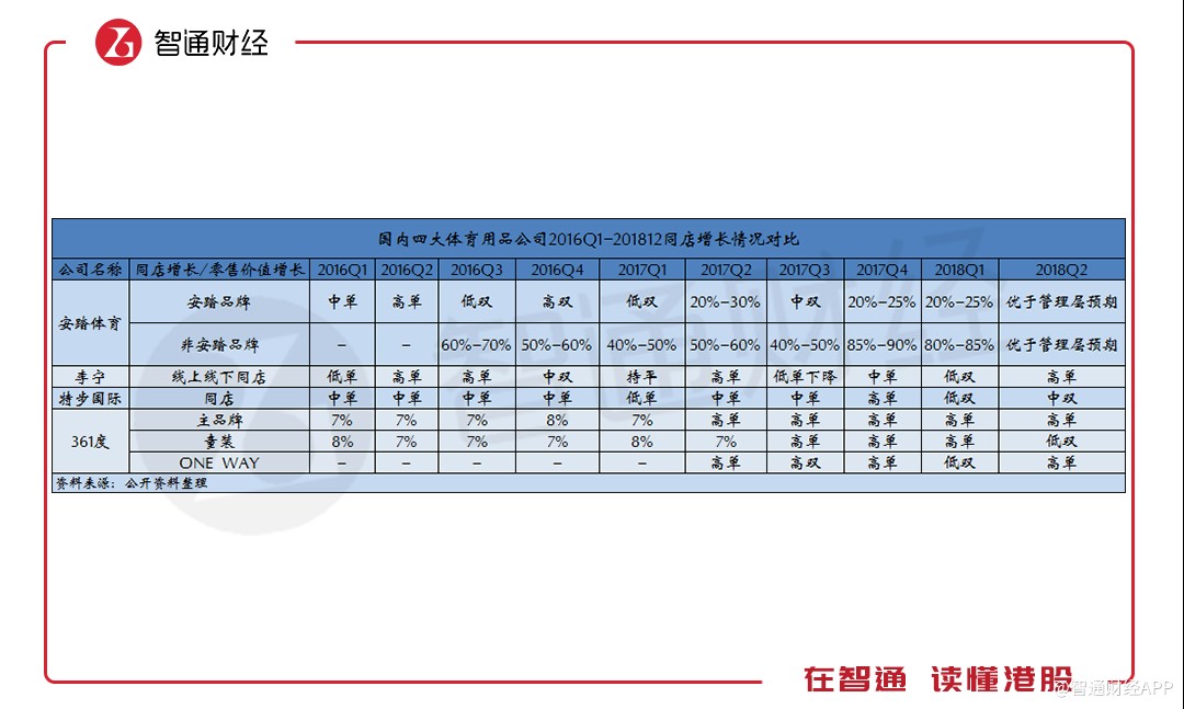 智通財(cái)經(jīng)APP根據(jù)公開資料整理發(fā)現(xiàn),特步過往季度的同店銷售增長水平時常保持在中單位數(shù)甚至低單位數(shù)的增長水平,直到2018年一季度才實(shí)現(xiàn)低雙位數(shù)增長,這也是公司自2013年一季度開始披露這一數(shù)據(jù)以來,首次達(dá)到雙位數(shù)增長。