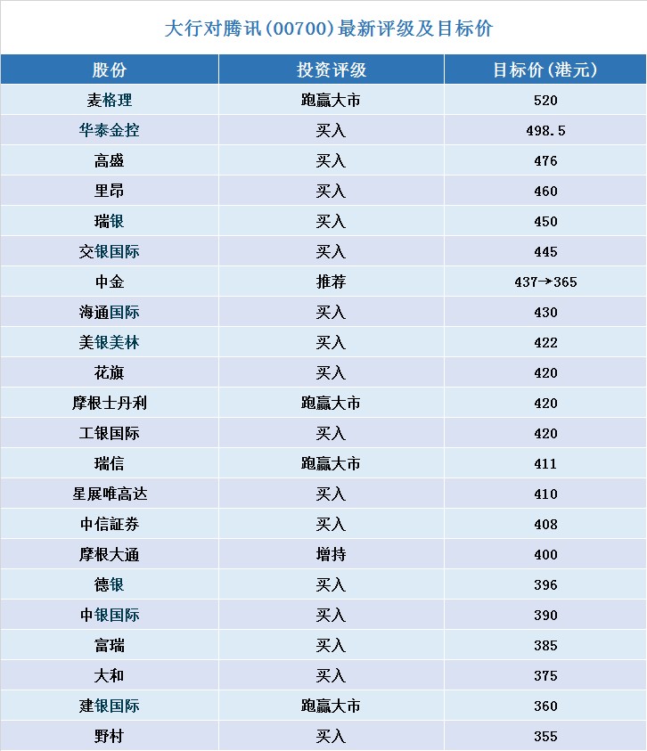 經(jīng)智通財經(jīng)APP整理的騰訊(00700)最新投資評級及目標價如下: