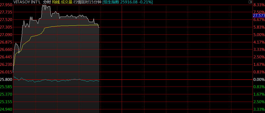 智通財(cái)經(jīng)APP獲悉,維他奶國際(00345)昨日午間公布中期業(yè)績,中期股東應(yīng)占利潤同比增長30%至5.18億港元,超市場預(yù)期。早盤股價(jià)漲勢延續(xù),截至9時(shí)56分,漲6.59%,報(bào)價(jià)27.5港元,成交額3661.58萬。
