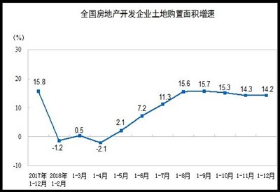 2018年房地產(chǎn)開(kāi)發(fā)企業(yè)土地購(gòu)置面積為29142萬(wàn)平方米,比上年增長(zhǎng)14.2%,比上年回落1.6個(gè)百分點(diǎn);土地成交價(jià)款16102億元,增長(zhǎng)18.0%,比上年回落31.4個(gè)百分點(diǎn)。