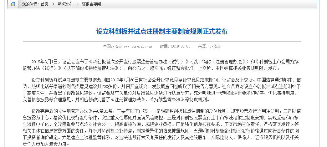 3月1日晚間,中國(guó)證監(jiān)會(huì)、上海證券交易所正式發(fā)布設(shè)立科創(chuàng)板并試點(diǎn)注冊(cè)制的主要制度規(guī)則。這表明,經(jīng)過(guò)一個(gè)月的意見(jiàn)征集,市場(chǎng)高度關(guān)注的科創(chuàng)板正式開(kāi)閘。要點(diǎn)總結(jié)如下:
