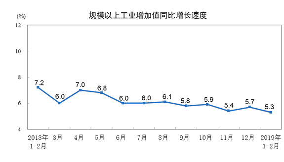智通財(cái)經(jīng)APP獲悉,國(guó)家統(tǒng)計(jì)局今日公布,2019年1-2月份,規(guī)模以上工業(yè)增加值同比實(shí)際增長(zhǎng)5.3%(以下增加值增速均為扣除價(jià)格因素的實(shí)際增長(zhǎng)率),預(yù)期增長(zhǎng)5.6%,前值為6.2%。據(jù)測(cè)算,剔除春節(jié)因素影響增長(zhǎng)6.1%。從環(huán)比看,2月份,規(guī)模以上工業(yè)增加值比上月增長(zhǎng)0.43%。