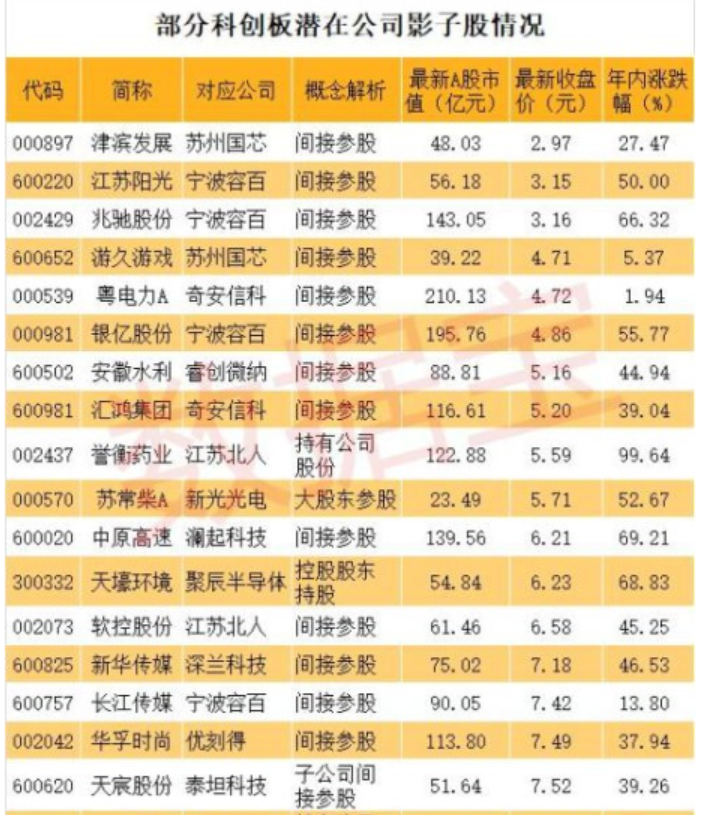 科創(chuàng)板影子股:首批創(chuàng)業(yè)板潛在公司背后有超過(guò)50只影子股,而這些影子股大多是間接持股。從持股比例來(lái)看,最大的是金固股份,持有泰恩達(dá)100%股權(quán)。其他影子股持股比例較大的還有,通化東寶持有33.94%特寶生物、上海醫(yī)藥持有26%復(fù)旦張江、三六零持有22.59%奇安信科、張江高科間接持有10.78%上海微電子、綠地控股持有13%深蘭科技、力源信息持有10.8%云漢芯城、科大國(guó)創(chuàng)持有10.15%譽(yù)存科技、南京高科持有8.65%賽特斯、駱駝股份持有6.25%金達(dá)萊等。