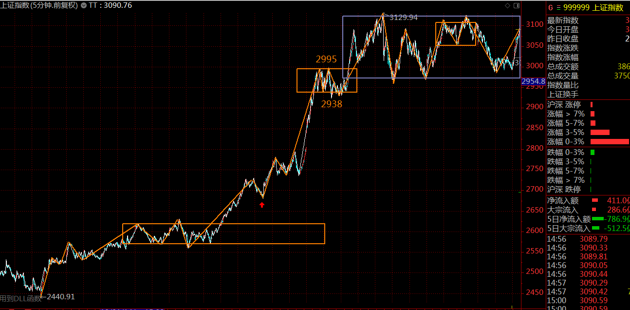 上證指數(shù)方面,這個(gè)位置的30分鐘中樞已構(gòu)建完成,調(diào)整隨時(shí)可以結(jié)束,方向選擇待定,關(guān)注30分鐘中樞上軌3125點(diǎn)壓力,30分鐘中樞下軌2968點(diǎn)支撐。就目前的市場(chǎng)情緒來看,傾向于向上突破中樞,構(gòu)建30分鐘的第三類買點(diǎn)(突破中樞上軌后,回調(diào)段不破中樞上軌)。