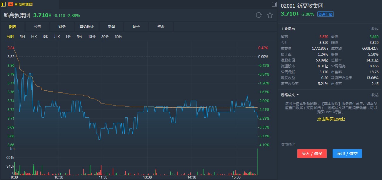 新高教日前公布,以先舊后新方式配售1.1億股,占擴大后已發(fā)行股本約7.14%,每股配售價為3.57元,較上日收市價3.93元,折讓約9.2%。所得款項凈額預(yù)期約3.89億元,擬用作償還債務(wù)及一般企業(yè)用途。配售完成后,除承配人外的公眾股東持股比例,將由44.66%降至41.47%。