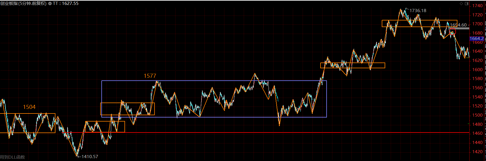 本輪行情的領先指數(shù)——創(chuàng)業(yè)板指數(shù)仍舊為多頭排列,目前同樣進入了五分鐘下跌趨勢第二個中樞的構建過程,可依托1600-1620區(qū)域展開布局。
