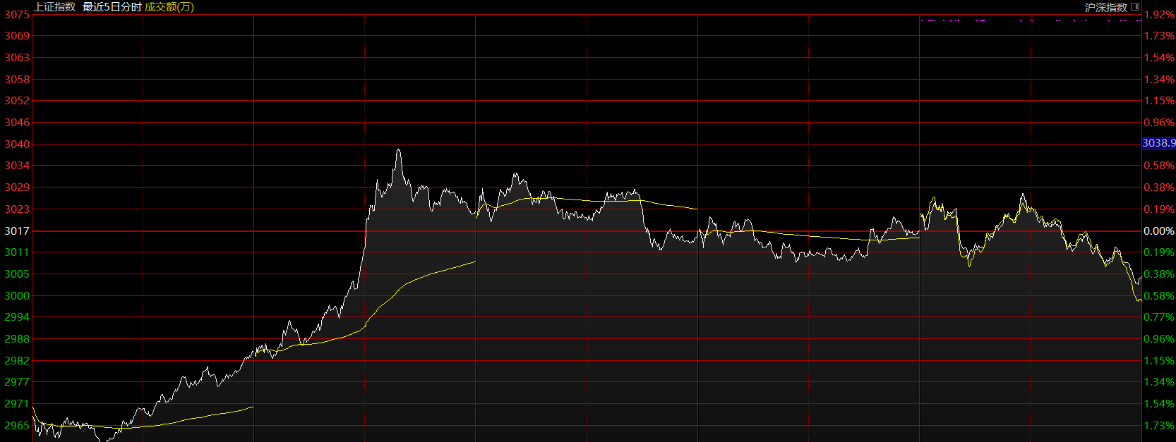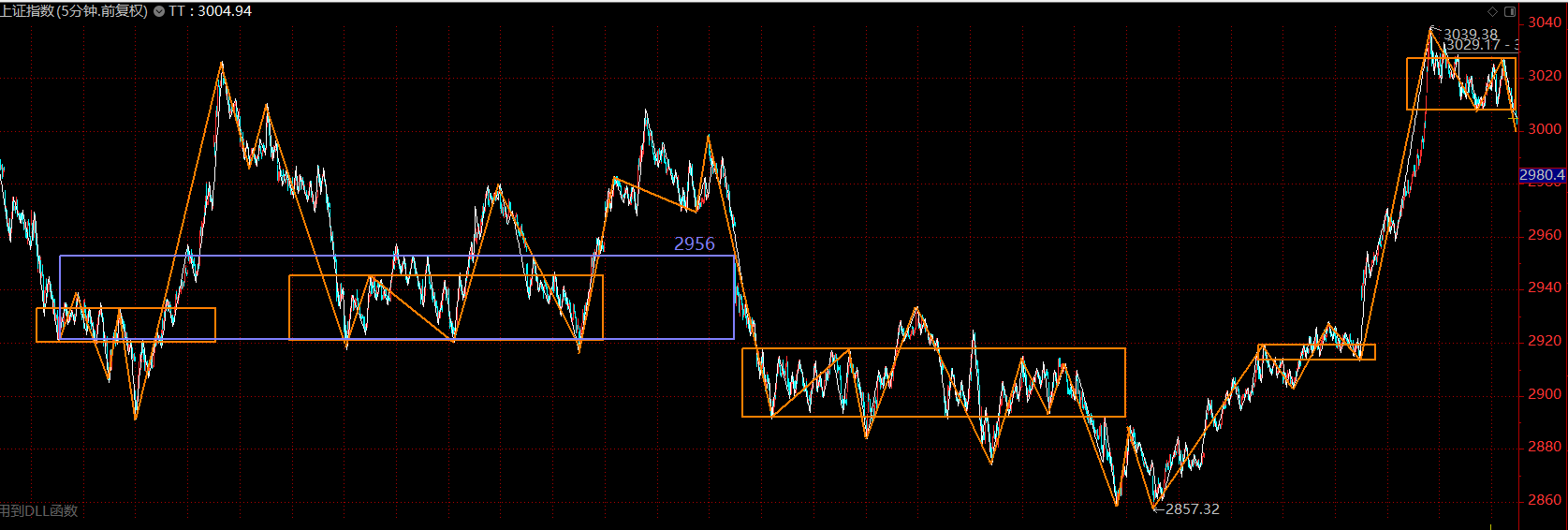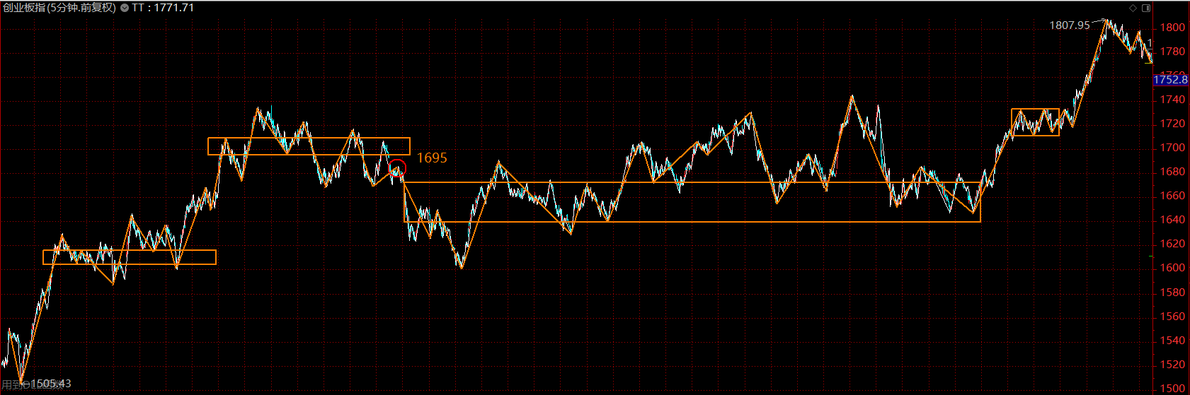 目前分析只需集中于這個(gè)五分鐘的上漲趨勢即可,上周如期做出了五分鐘上漲趨勢第二個(gè)中樞的雛形。前面幾天表現(xiàn)其實(shí)蠻超預(yù)期的,特別是科技股的逼空,A股似乎許久未見了。核心問題出在周五,周五有兩個(gè)點(diǎn)顯示出當(dāng)下市場的外強(qiáng)中干,第一個(gè)在于周五早盤南京證券反包漲停時(shí),市場資金的失衡,明顯看出科技股與券商股兩臺(tái)“抽水機(jī)”從前幾天的互相配合變成了互相傷害;這一段跳水直接將圖形破壞,強(qiáng)度大的新高背馳可以說已經(jīng)沒有了,那下午上拉無力后的跳水也就在情理之中。