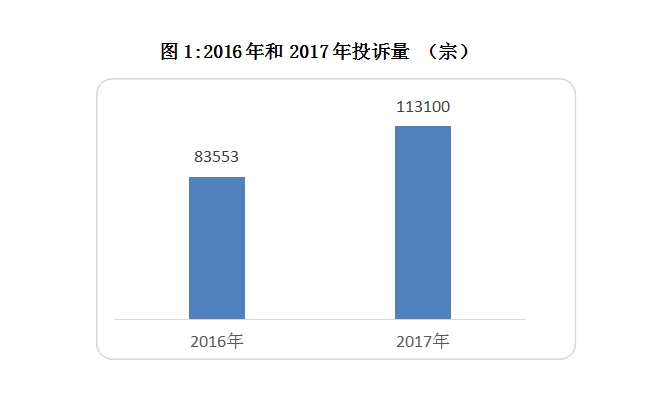 2017年,深圳市、區(qū)消委會共接受消費(fèi)者投訴113100宗,比2016年的83553宗增長了35.36%?!?15消費(fèi)通”系統(tǒng)來源投訴65065宗占比58%,12315電話來源投訴45888宗占比41%,可見“315消費(fèi)通”系統(tǒng)已經(jīng)成為消費(fèi)者投訴主要方式。