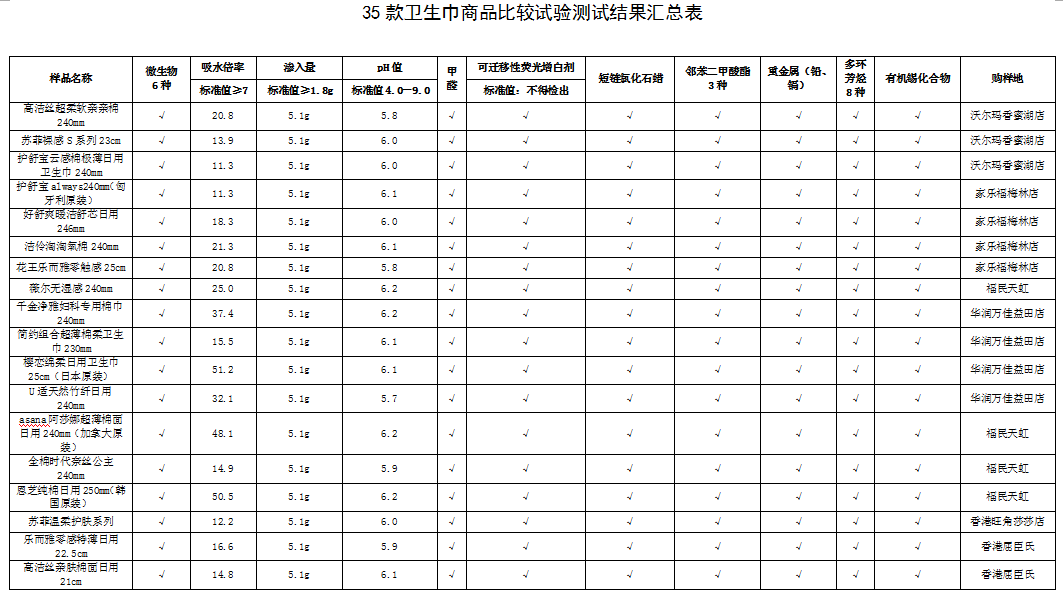 試驗結果表明參與比較試驗的35款衛(wèi)生巾產品,從安全指標方面來看未檢測出超標問題;使用性能指標方面也均達到測試標準,女性消費者可放心選購。