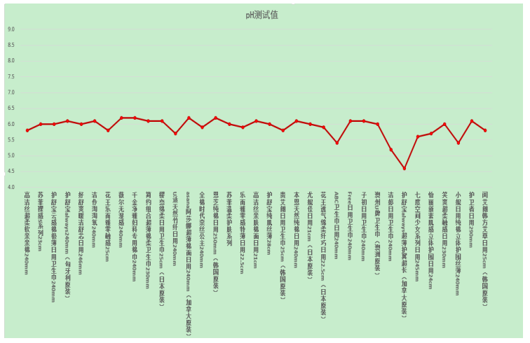 女性特殊時期的抗病能力大大降低,而與皮膚密切接觸的衛(wèi)生巾的酸堿度即pH值是關(guān)乎女性特殊時期健康的重要因素。據(jù)婦幼保健醫(yī)生介紹,衛(wèi)生巾的pH值在弱酸性至堿性對人體最安全。本次比較試驗(yàn)35款衛(wèi)生巾pH值測試結(jié)果均在4.5到6.5之間,對人體無害。pH值測試結(jié)果見下圖。