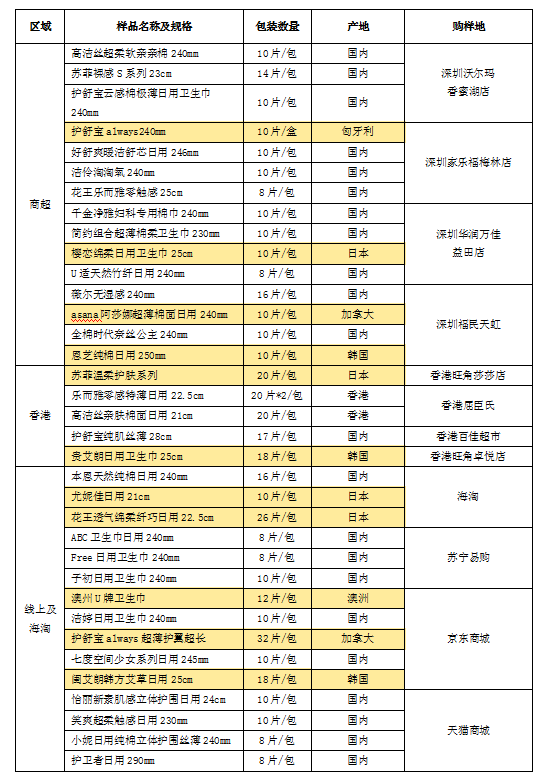 據(jù)前期調(diào)研發(fā)現(xiàn),國外品牌衛(wèi)生巾更受女性消費(fèi)者青睞,很多消費(fèi)者認(rèn)為國外品牌衛(wèi)生巾質(zhì)量更優(yōu)更值得信賴,進(jìn)而選擇跨境或海淘等方式購買國外產(chǎn)品。因此,本次樣品分別從深圳商超、香港、線上海淘購買樣品進(jìn)行測試和比較,樣品涉及11款國外原裝產(chǎn)品。詳見下表。