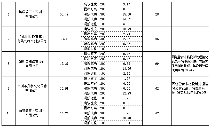 在本次公布的教育培訓(xùn)行業(yè)消費(fèi)維權(quán)信用指數(shù)排名中,深圳市明德盛世教育科技有限公司的消費(fèi)維權(quán)信用指數(shù)為76.25,排名第一,其2017年4月1日至2018年3月31日期間的投訴量為31宗;坤澤教育(深圳)有限公司的消費(fèi)維權(quán)信用指數(shù)為14.24,排名第十,其2017年4月1日至2018年3月31日期間的投訴量為42宗。