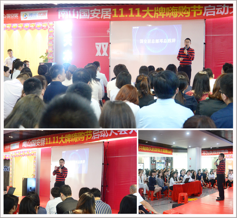 深圳新聞網(wǎng)訊 10月22日下午,“國安居南山店&騰訊優(yōu)居雙11大牌嗨購節(jié)”活動(dòng)啟動(dòng)大會(huì)在國安居南山店四樓隆重舉行。國安居南山店各品牌商家老板及銷售精英匯聚于此,正式擂響“雙11大促”的出征鼓!