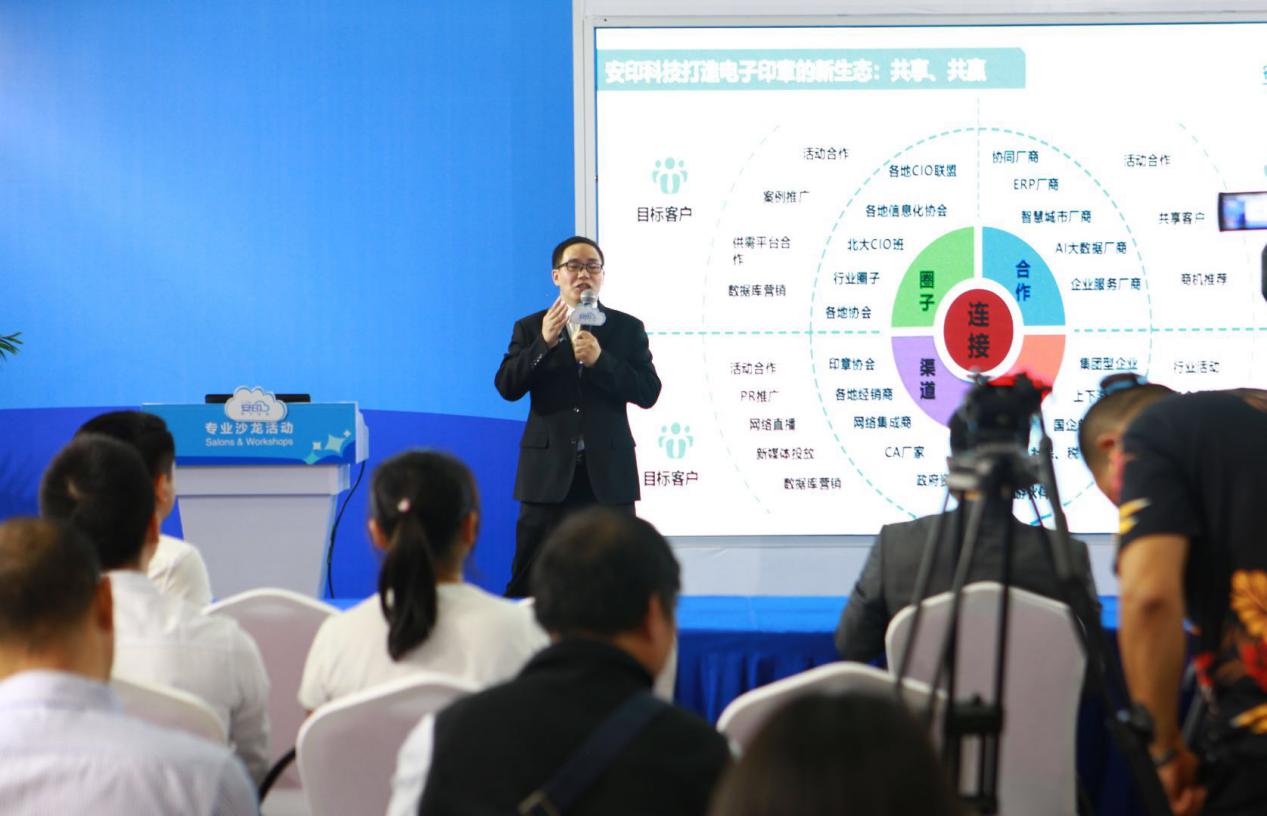 隨后,安印科技營(yíng)銷副總劉昕發(fā)表了演講,他給大家分享了安印對(duì)電子簽章技術(shù)應(yīng)用前景的思考和探索,并對(duì)安印電子印章生態(tài)圈進(jìn)行全方位的解讀。劉總表示,對(duì)于企業(yè)來(lái)說(shuō)進(jìn)入數(shù)字時(shí)代的深遠(yuǎn)影響與沖擊,絕不僅僅是技術(shù)上的創(chuàng)新與突破,更將是一次理念認(rèn)識(shí)的徹底洗禮。通過(guò)由傳統(tǒng)蓋章模式向互聯(lián)網(wǎng)簽章模式的轉(zhuǎn)變,安印電子印章生態(tài)圈能有效地助力企業(yè)運(yùn)營(yíng)的提質(zhì)、增效、降本,不斷迸發(fā)出改變與前進(jìn)的力量。