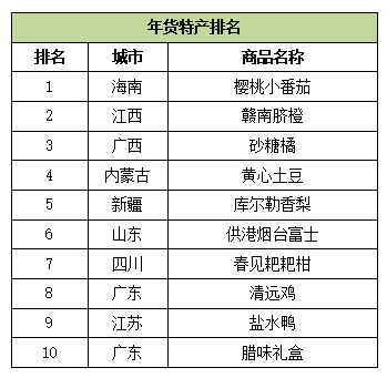 9.禮盒去哪兒:不少在北上廣深的消費者將年貨禮盒寄回了老家,以下10個城市收到的遠方問候最多:濟南/沈陽/青島/成都/重慶/天津/西安/長沙/鄭州/武漢。