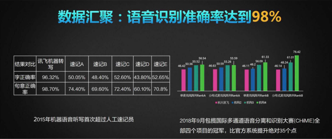 在英文語音識(shí)別、機(jī)器閱讀理解、國際識(shí)別挑戰(zhàn)賽等多個(gè)A.I.領(lǐng)域的國際賽事 中,科大訊飛均名列前茅, 至今已獲得12項(xiàng)世界第一。2018年9月,訊飛再次包攬國際多通道語音分離和識(shí)別大賽(CHiME-5)全部四個(gè)項(xiàng)目的冠軍,該大賽被稱為“史上最難語音識(shí)別任務(wù)”,考察的是在不同場景中自由交談的遠(yuǎn)場語音識(shí)別效果。也再次證實(shí)了訊飛語音識(shí)別在噪音、口音和遠(yuǎn)場識(shí)別挑戰(zhàn)下的絕對(duì)領(lǐng)先優(yōu)勢。與此同時(shí),訊飛轉(zhuǎn)寫引擎于2005年開始應(yīng)用服務(wù),期間歷經(jīng)數(shù)次迭代升級(jí)。