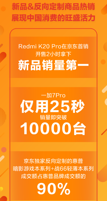 Redmi K20 Pro特地選擇在京東618期間首銷,其中還針對京東的用戶推出了京東獨家版本,而Redmi K20 Pro的整體銷售成績也表現(xiàn)不俗,在開售2小時就拿下新品銷量第一;而在京東618期間推出的一加7Pro,僅用了25秒就銷售上萬部。
