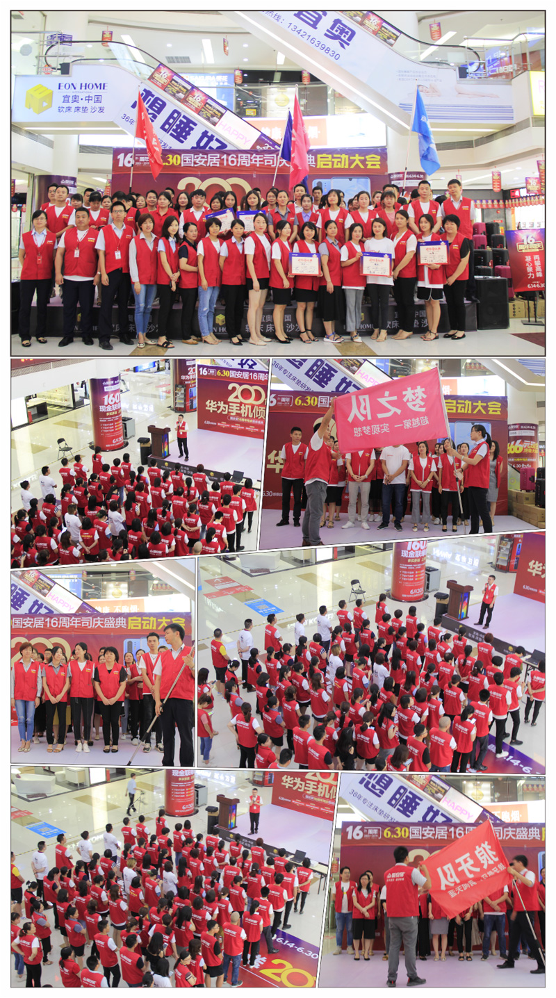 6月13日-14日,國(guó)安居“16周年司慶”啟動(dòng)大會(huì)在國(guó)安居深惠門店火熱舉行,800家品牌商家的銷售精英、員工代表、熱心市民等近萬(wàn)余人共同見證了這一意義非凡的時(shí)刻。參與者身著統(tǒng)一服裝,早早就聚集在商場(chǎng)中庭,所有人都把笑容掛在臉上,展現(xiàn)出自己最陽(yáng)光、最開心、最具活力的一面。