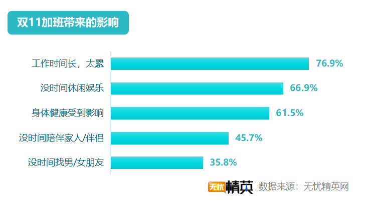 雙11高強度的加班,導(dǎo)致職場精英們的生活受到較大影響,76.9 %的人因為工作時間過長,覺得太累;66.9 %的人因為加班沒有時間休閑娛樂;61.5 %的人身體健康帶來影響;45.7 %的人沒時間陪伴家人/伴侶;更有35.8 %的人,將沒有男朋友/女朋友的鍋,扣到了雙11的頭上。