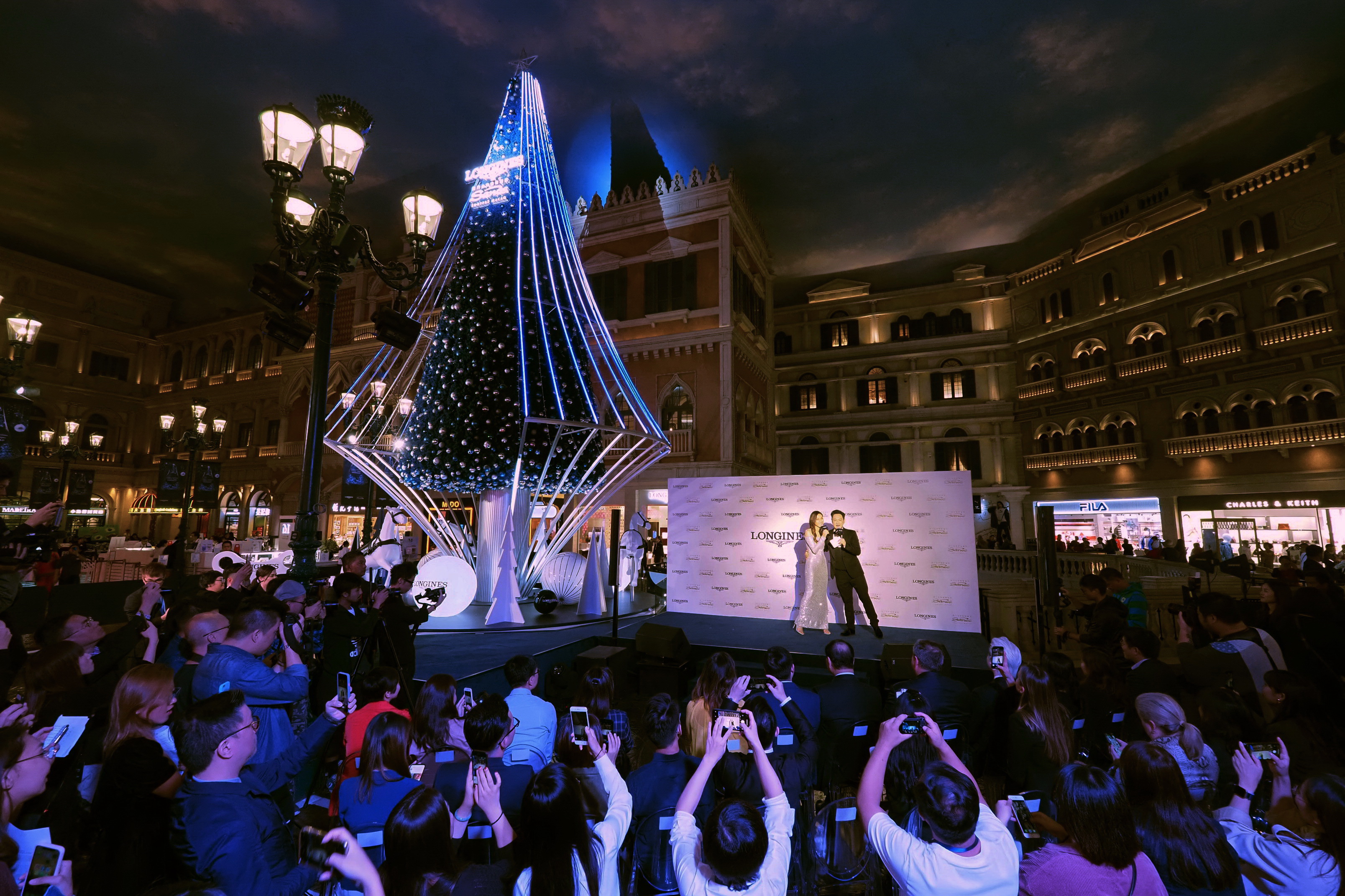 亮燈儀式于威尼斯人購(gòu)物中心圣馬可廣場(chǎng)舉行,影視明星鐘嘉欣受邀出席,并與浪琴澳門(mén)副總裁鄭美齡、金沙中國(guó)有限公司零售市場(chǎng)推廣副總裁Rita Simonetta及金沙中國(guó)有限公司商場(chǎng)管理部總監(jiān)梁俊強(qiáng)一同啟動(dòng)高達(dá)13米的藍(lán)色菱形圣誕樹(shù)底部的音樂(lè)盒裝置。