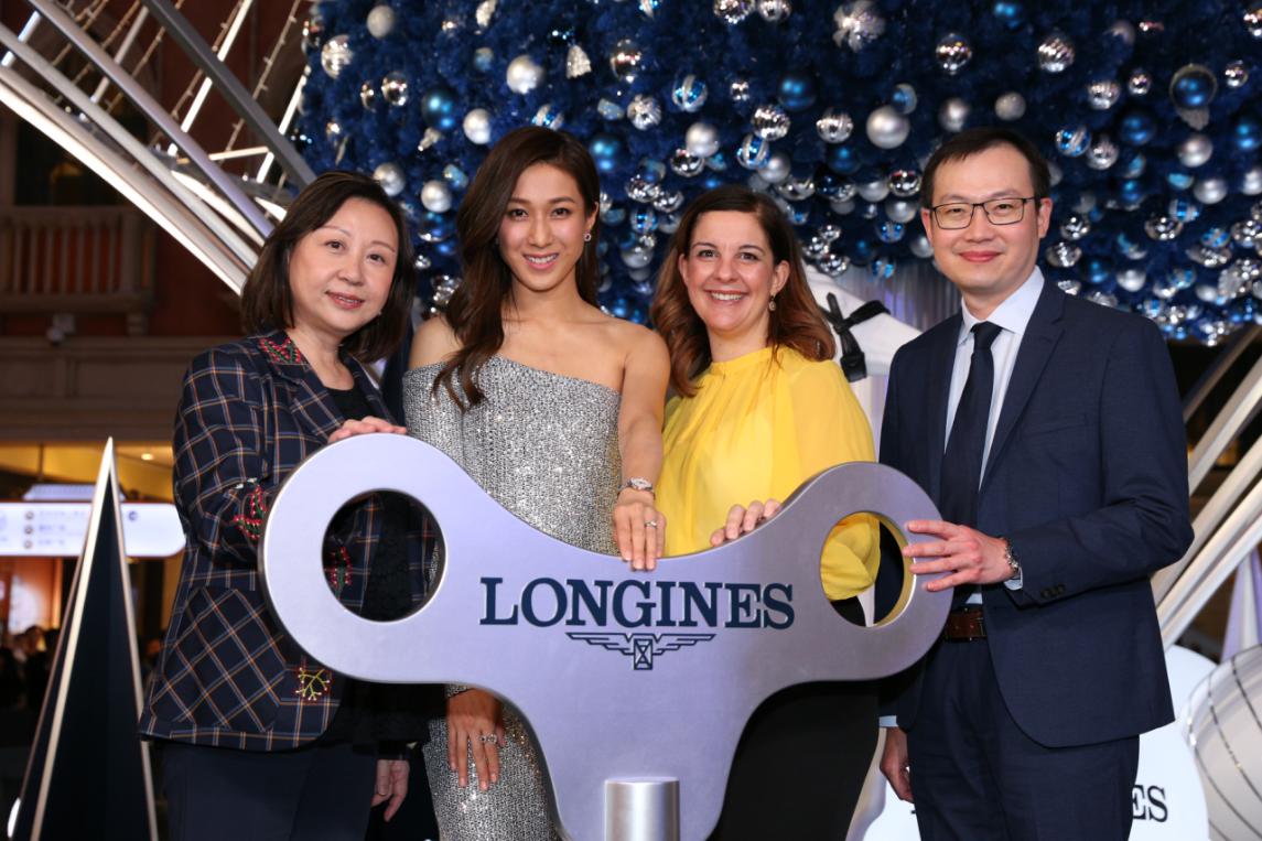 (左起)浪琴澳門(mén)副總裁鄭美齡、影視明星鐘嘉欣、金沙中國(guó)有限公司零售市場(chǎng)推廣副總裁Rita Simonetta及金沙中國(guó)有限公司商場(chǎng)管理部總監(jiān)梁俊強(qiáng)一同啟動(dòng)高達(dá)13米的藍(lán)色菱形圣誕樹(shù)底部的音樂(lè)盒裝置。