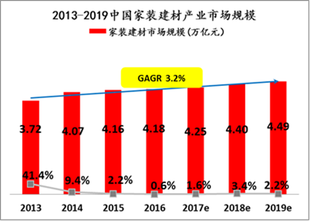 億歐智庫數(shù)據(jù)顯示,目前家裝市場復(fù)合年增長率維持在3.2%,2019年家裝市場銷售規(guī)模接近4.5萬億,但家裝建材互聯(lián)網(wǎng)滲透率小于10%,經(jīng)營模式以傳統(tǒng)的區(qū)域性“散打”為主,無法滿足90后主體消費(fèi)者互聯(lián)網(wǎng)化、社交化、全國性購買的需求,家裝行業(yè)大整合的呼聲越來越高。