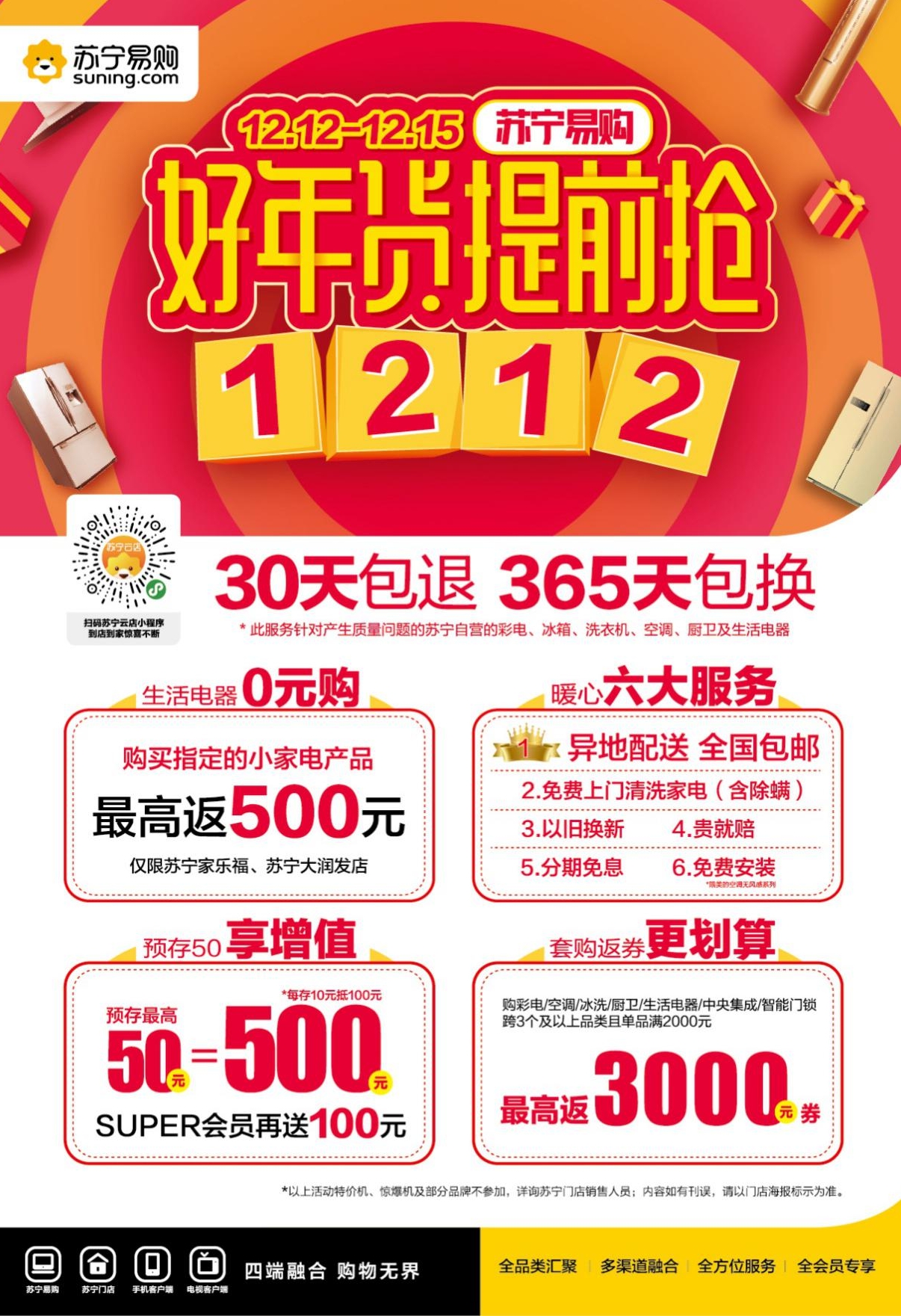 同時(shí),深圳蘇寧還聯(lián)合各大知名品牌為廣大消費(fèi)者推出了多重超強(qiáng)福利,在活動(dòng)力度上,預(yù)存50元可抵500元的家電購(gòu)物抵用券,并且套購(gòu)多個(gè)產(chǎn)品最高可返3000元的優(yōu)惠券。除此之外,蘇寧家樂福、蘇寧大潤(rùn)發(fā)、蘇寧歐尚聯(lián)合推出生活家電0元購(gòu)活動(dòng),消費(fèi)者購(gòu)買生活電器可返產(chǎn)品價(jià)格的同等金額,最高省500元。并且雙十二當(dāng)天在蘇鮮生購(gòu)物使用蘇寧金融支付新用戶滿50元減20元,老用戶滿30元減10元,12月15日在蘇寧小店購(gòu)物使用翼支付還可享5折立減??梢灶A(yù)見,從產(chǎn)品、價(jià)格、服務(wù)、活動(dòng)各個(gè)方面不斷提升消費(fèi)者購(gòu)物體驗(yàn)的深圳蘇寧將成為消費(fèi)者選購(gòu)年貨的不二選擇。(吳艷)