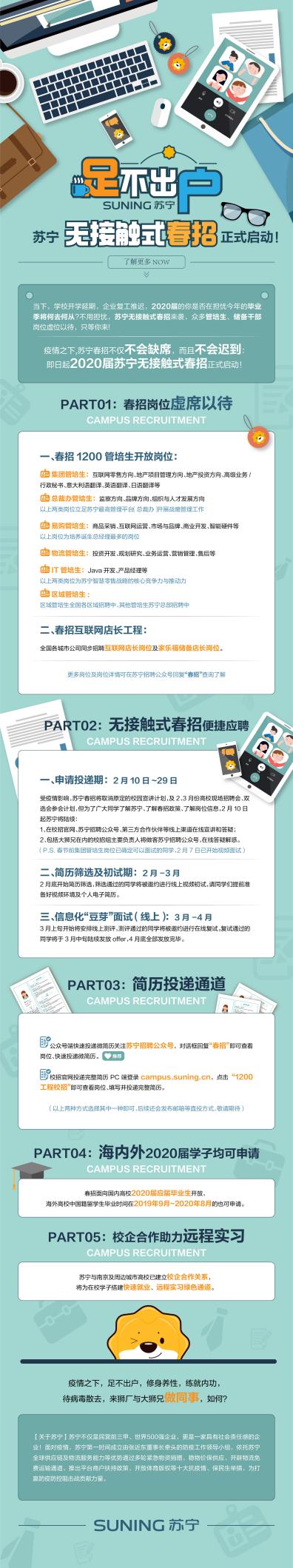 2月8日,蘇寧官方表示,疫情之下,將啟動(dòng)無(wú)接觸式春招,全力保障春招正常進(jìn)行。春節(jié)前確定可面試的畢業(yè)生,2月7日已陸續(xù)開(kāi)始視頻面試。