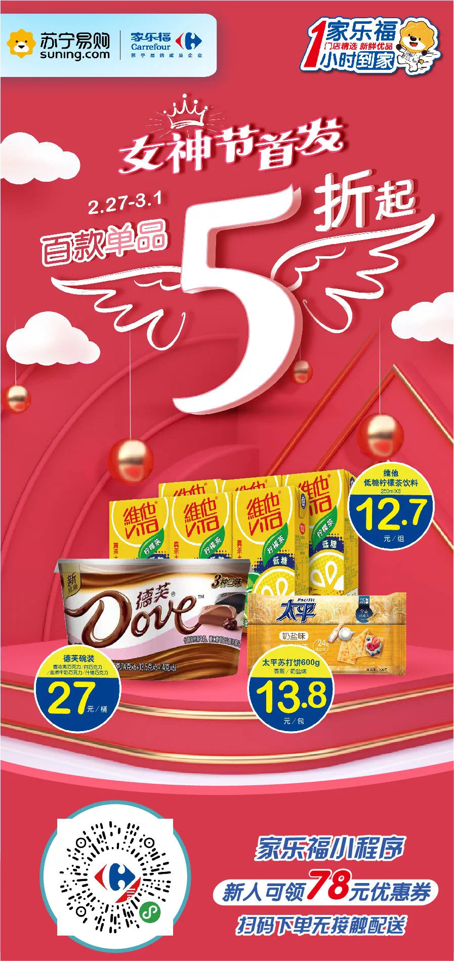 此外,還有上百款5折好物,即刻搶起來!德芙巧克力27元/桶、維他低糖檸檬茶12.7元/組,太平蘇打餅600g裝13.8元/包。家樂福小程序無接觸配送,宅家輕松購(gòu)!