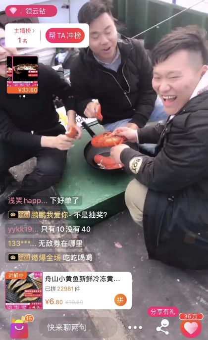 直播間熱鬧非凡,海上的信號卻不作美,直播間有些卡頓,嚴(yán)重時,直接斷線。一旁拼購的技術(shù)人員陳蘇楠、常超及時調(diào)整,穩(wěn)住了直播信號。尹鴻怕會流失觀眾,誰料,重新打開后發(fā)現(xiàn),觀眾非但沒少,反而增加了很多。