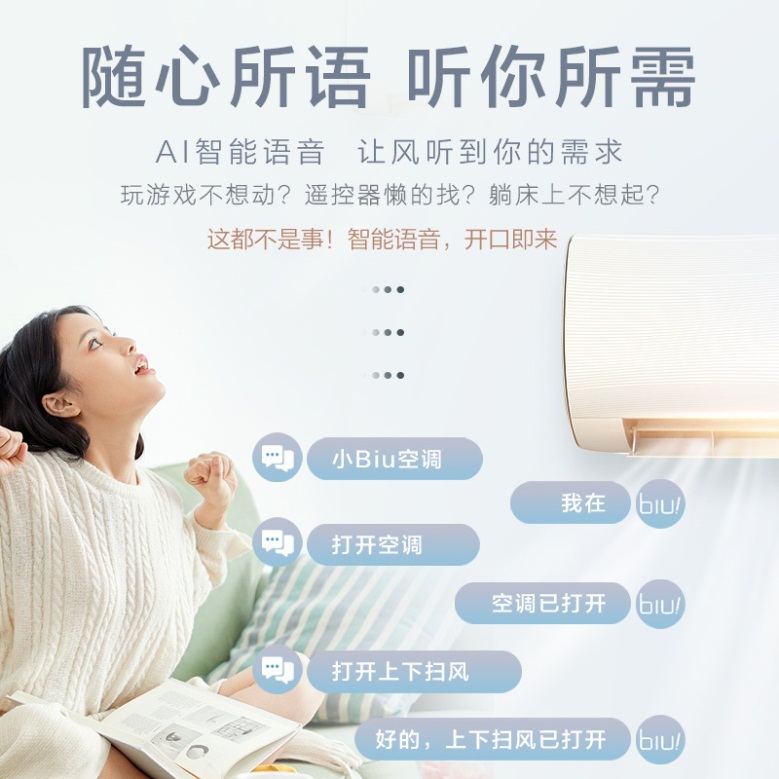 此外,小Biu空調(diào)Max搭載了AI智能語音控制技術(shù),你只需要對它說“小Biu空調(diào)”將其喚醒,就能實現(xiàn)開機關(guān)機、模式切換、調(diào)節(jié)溫度等操作,實現(xiàn)了真正的智能語音操控。同時,小Biu空調(diào)Max采用行業(yè)一流的海立壓縮機,并具有高溫自清潔、APP遠程控制、急速冷暖等亮點功能,提供整機6年、壓縮機10年保修的服務(wù)。