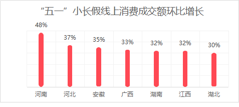 “五一”小長假尤其對河南、河北、安徽等中部省份的線上消費拉動作用更強(qiáng)。由于一線城市的線上消費趨于日?;藗兌嗤獬龌顒?,用親近大自然、戶外活動的方式度過假日。同時,一部分在大城市里工作的人員也在假日返回老家,帶動了中部省份的線上消費。